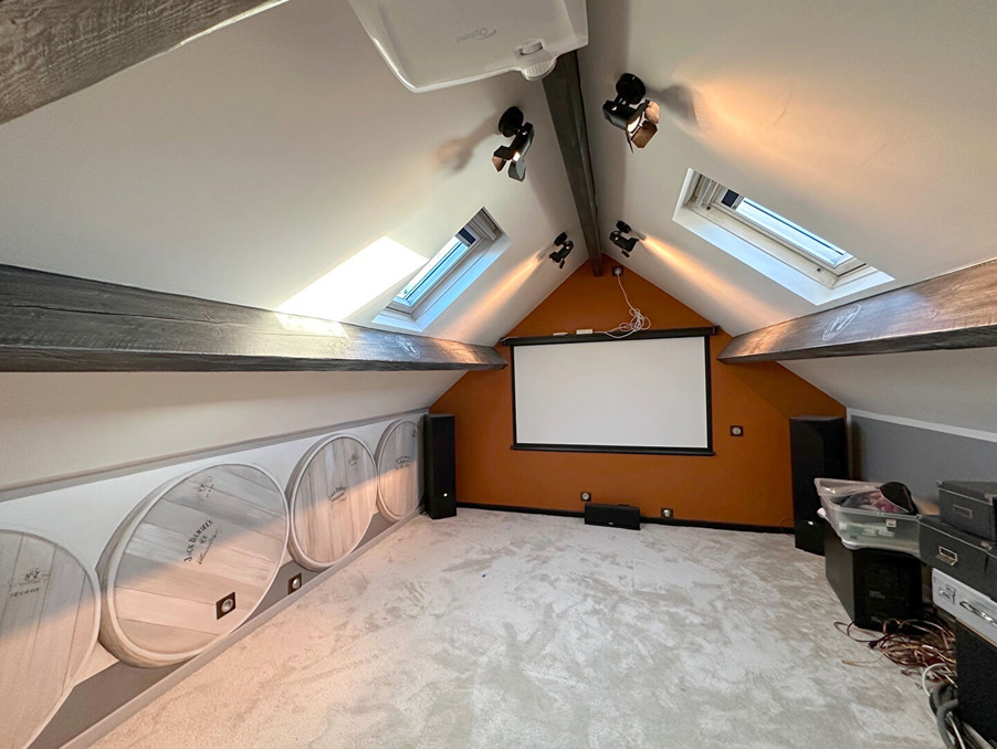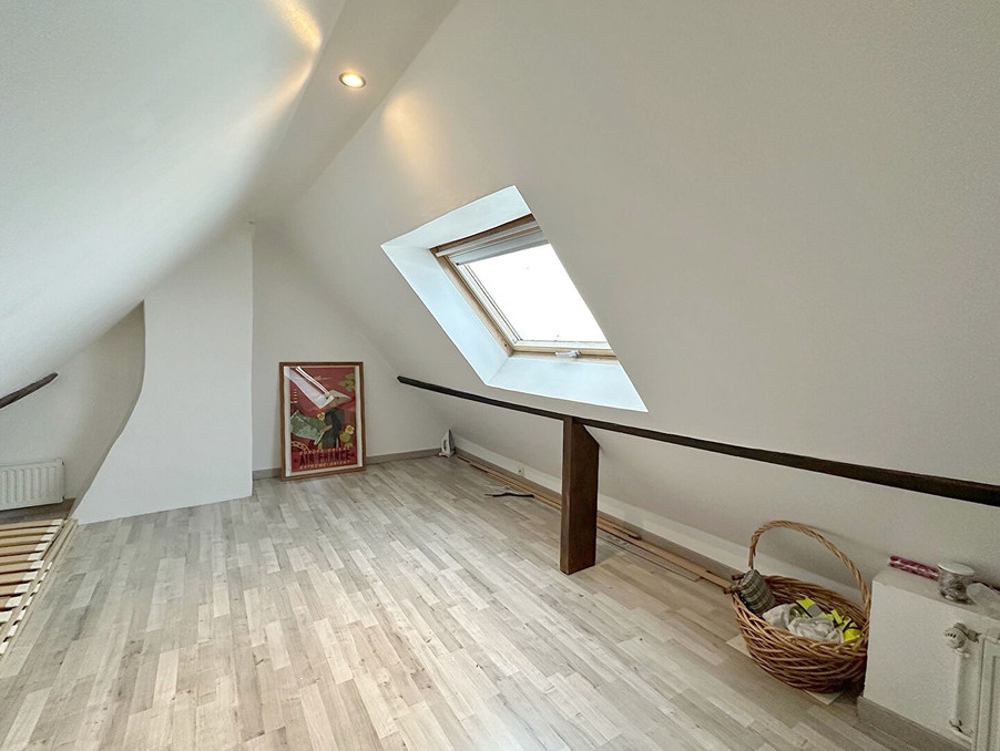 Au premier étage : deux chambres dont une avec dressing, salle de bains, wc, une pièce.