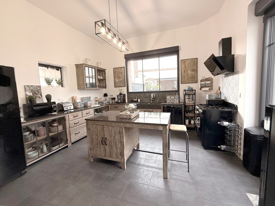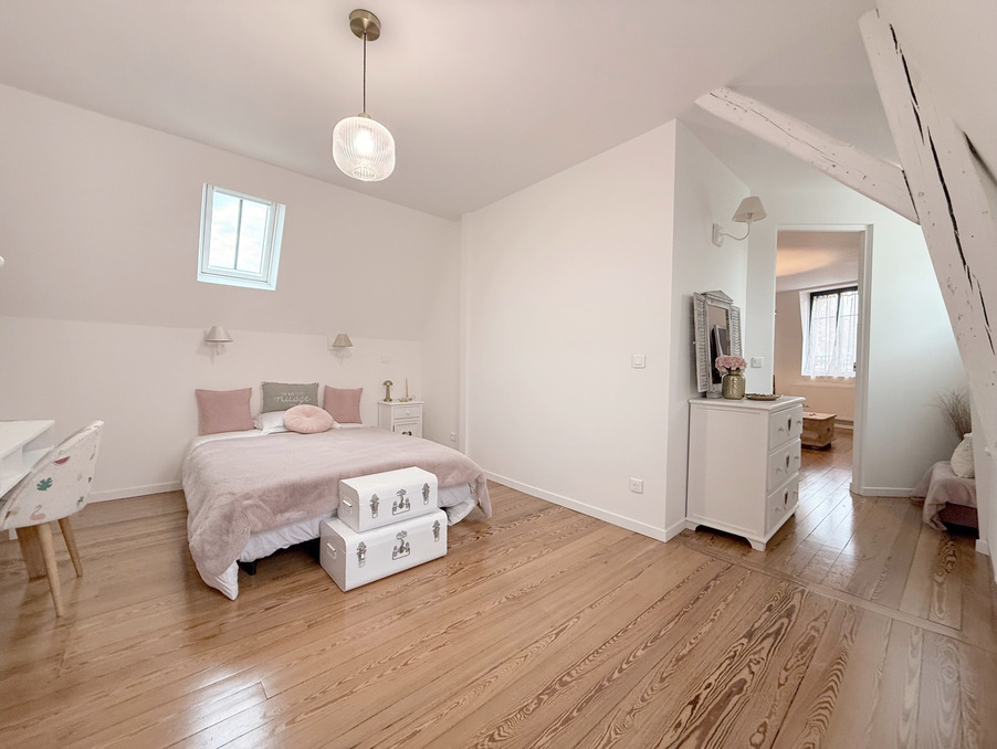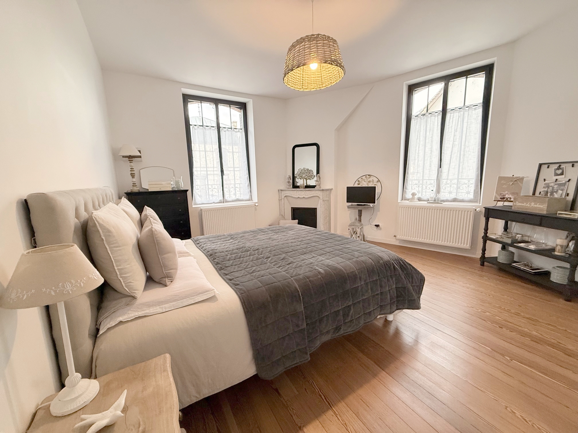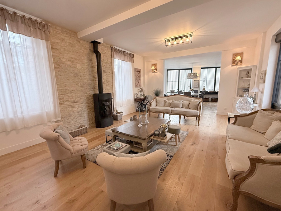Secteur NOGENT LE ROIMaison bourgeoise entièrement restaurée comprenant entrée avec placard, grand salon salle à manger avec poêle, une grande pièce avec cuisine américaine aménagée, buanderie / chaufferie, wc avec lave-mains.