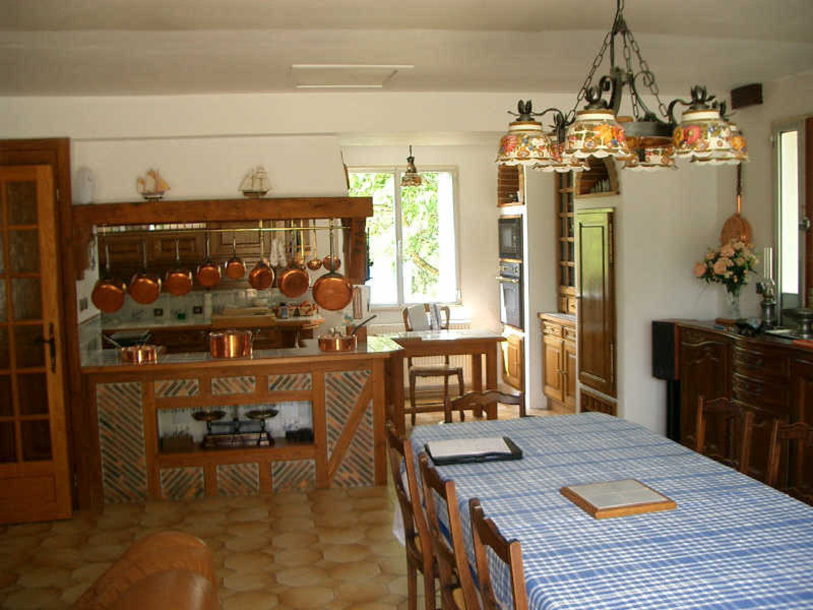 Pavillon comprenant grand séjour avec cheminée, cuisine américaine aménagée et équipée, 3 chambres, salle de bains, wc.~Sous-sol total avec une pièce, chaufferie, garage 2 voitures. Terrain d'environ 900 m².~Réf 239