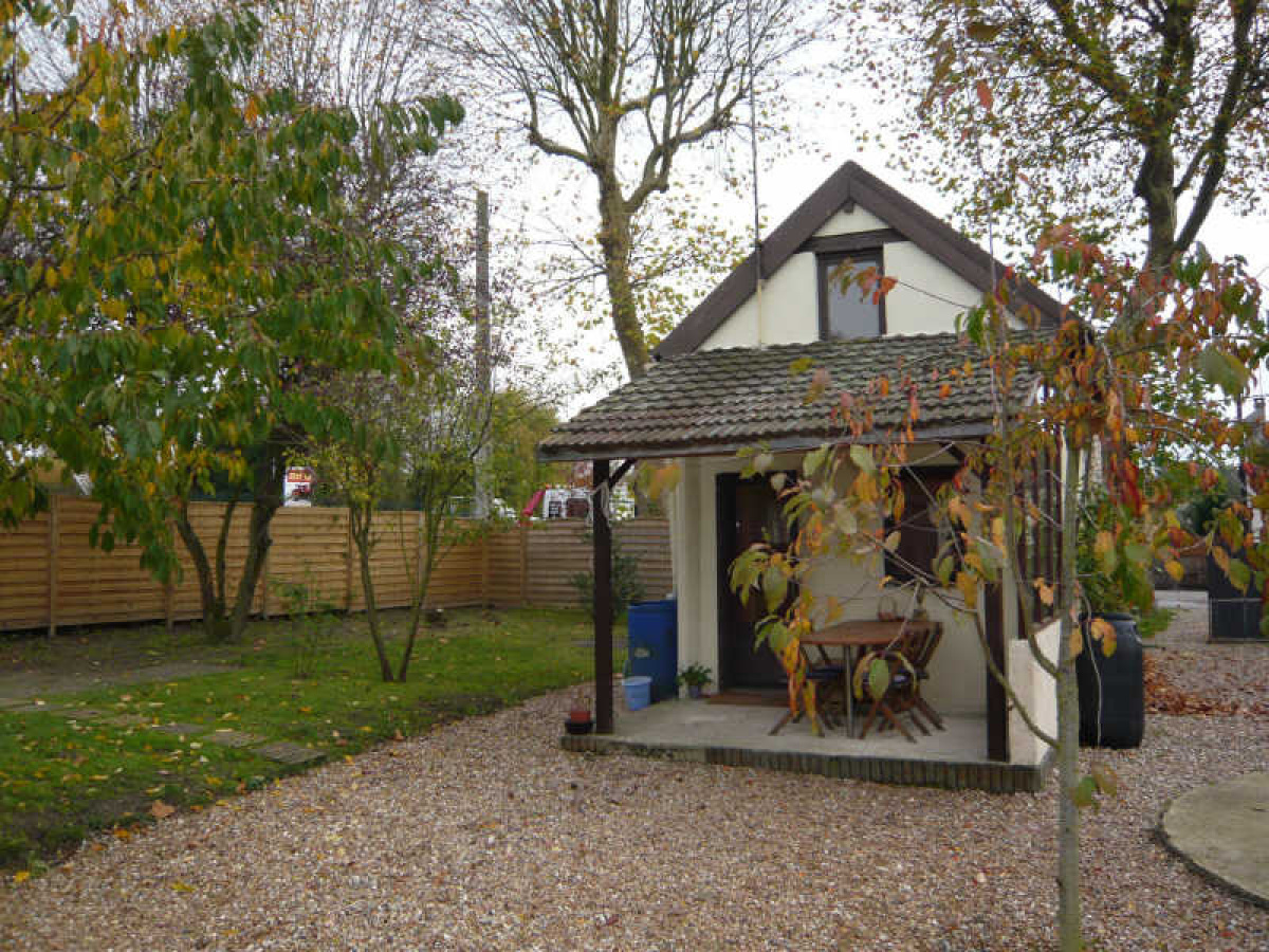 Pavillon comprenant cuisine américaine aménagée, séjour avec poêle, véranda.~A l'étage : chambre avec salle de bains et wc.~Agrandissement possible.~Garage. Chalet. Terrain clos d'environ 416 m².~Proche toutes commodités, accès rapide N12.~Réf 964
