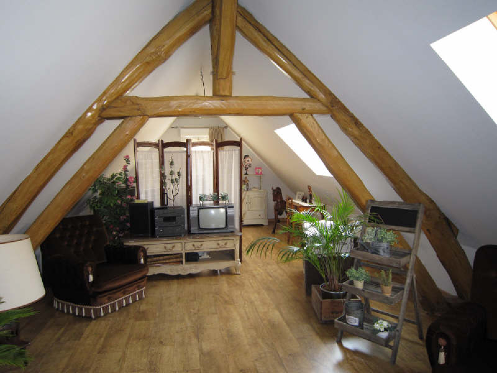 Maison ancienne comprenant entrée, grand séjour avec cheminée, cuisine américaine aménagée, chaufferie, wc, 2 chambres dont une avec douche et point d'eau, et une avec cheminée.~A l'étage : grande pièce palière (chambre possible), chambre avec dressing, salle de bains, wc.~Cave. Garage.~Terrain clos d'environ 2.000 m².~Assainissement refait en 2007. Electricité et toiture neuves.~Réf 1408