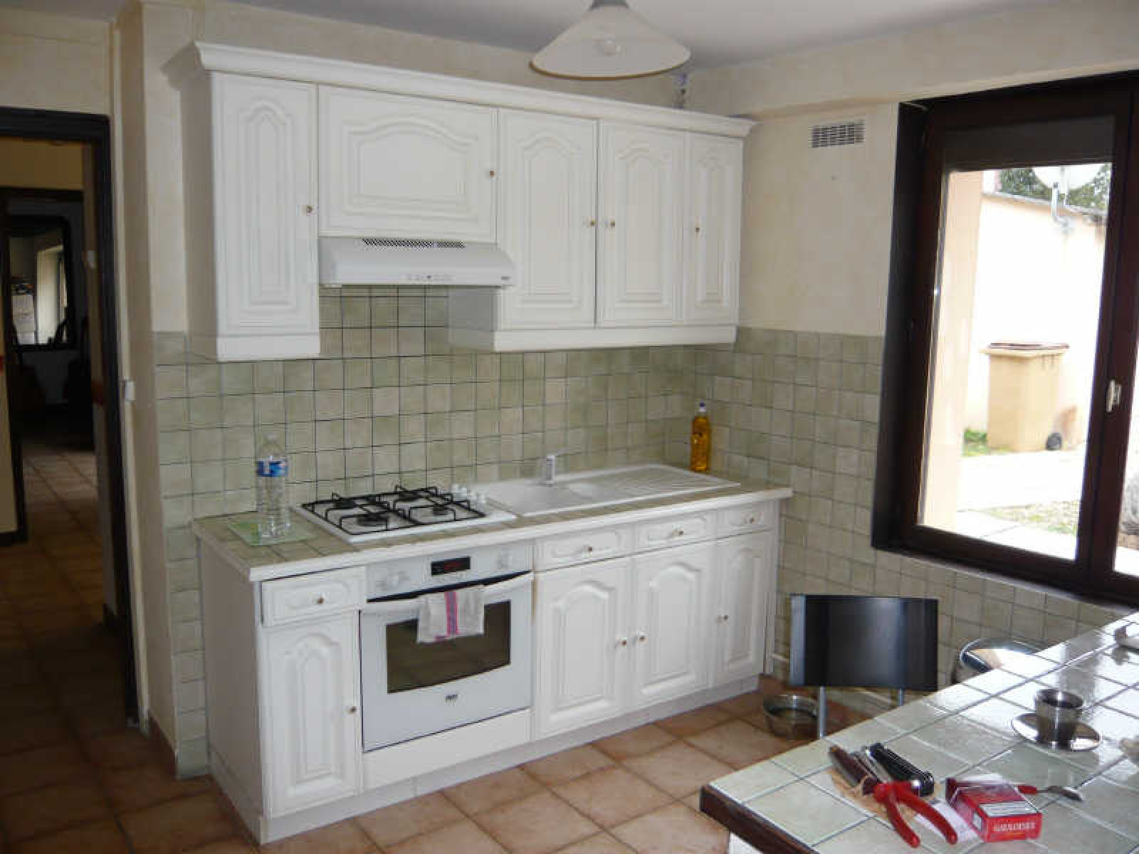 Maison ancienne comprenant entrée, séjour, cuisine américaine aménagée et équipée avec coin repas et cheminée, arrière-cuisine, buanderie / chaufferie, wc.~A l'étage : palier, 3 chambres, salle de bains.~Garage. Terrain clos d'environ 275 m².~Ecoles sur place, commerces à proximité.~Réf 1081