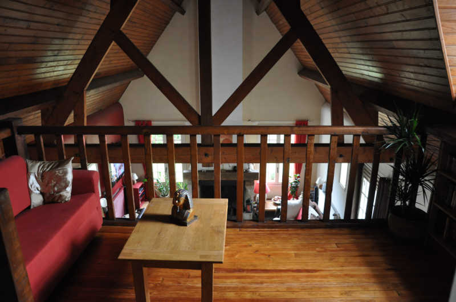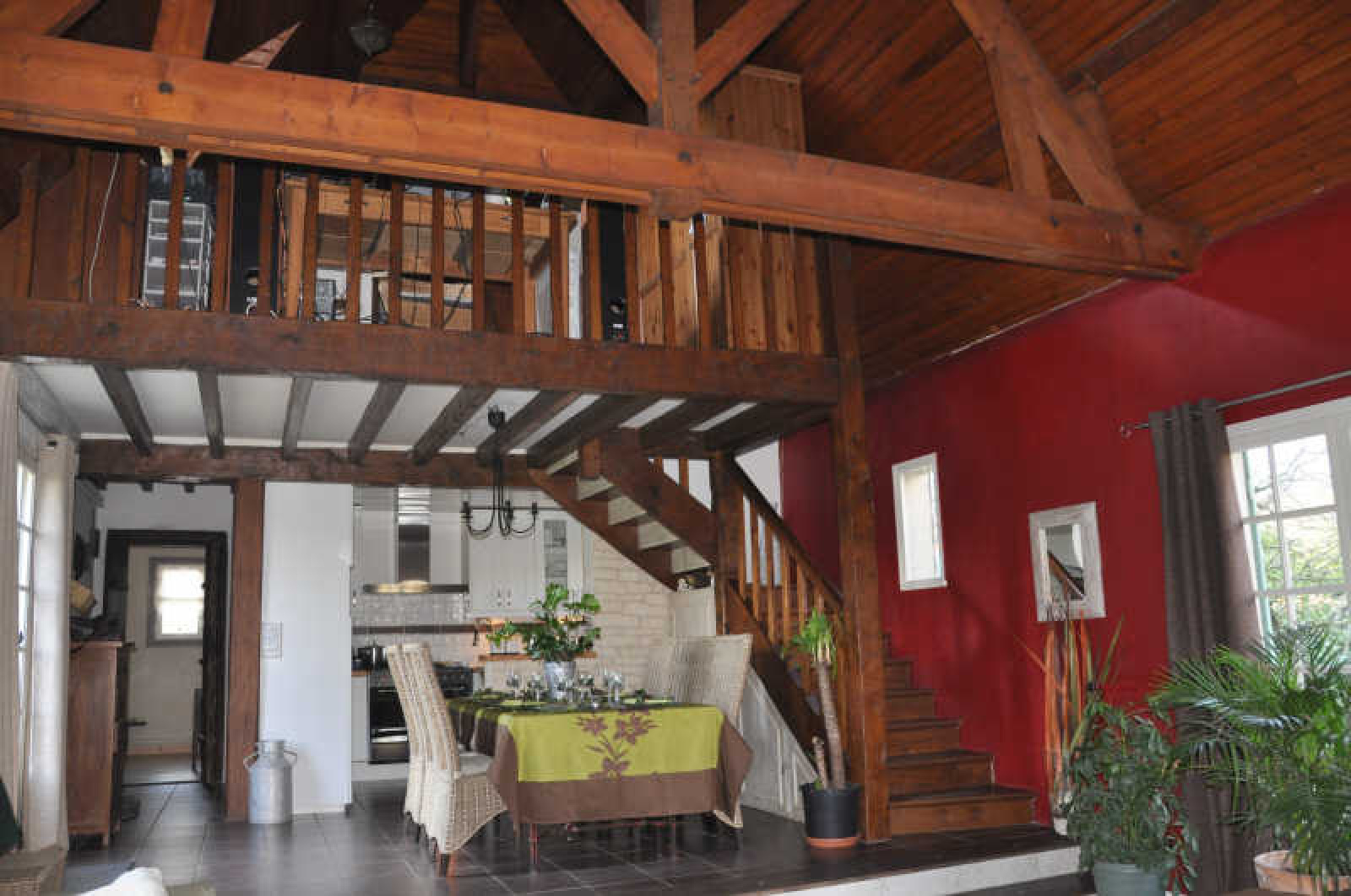 Maison style fermette comprenant grand séjour en partie cathédrale avec cheminée, cuisine américaine aménagée et équipée, salle de douche, wc, 4 chambres dont une avec salle de bains.~A l'étage : pièce en mezzanine, coin bureau, 2 pièces communicantes, chambre, salle de bains, wc.~Garage et buanderie. Cave voûtée. Terrain clos d'environ 1.200 m².~Proche toutes commodités.~Réf 856