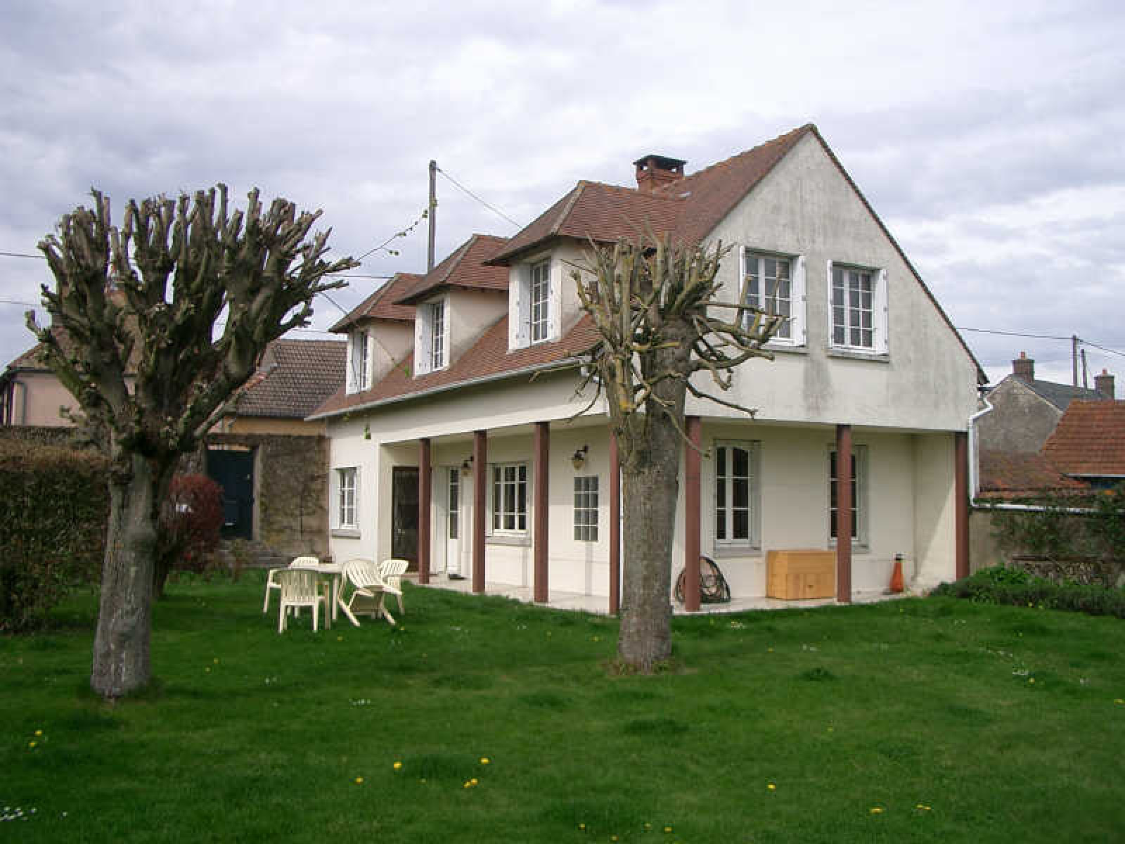 Pavillon comprenant cuisine aménagée, salon salle à manger avec cheminée insert, wc.~A l'étage : palier, 3 chambres, salle de bains, wc.~Petit grenier de rangement.~Terrain d'environ 700 m².~Réf 755