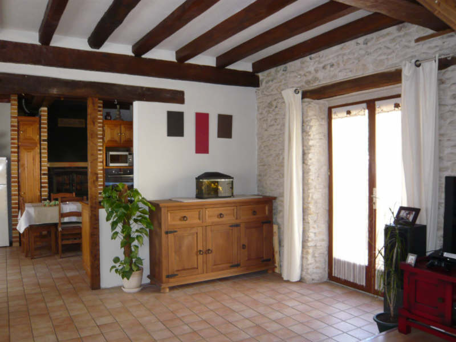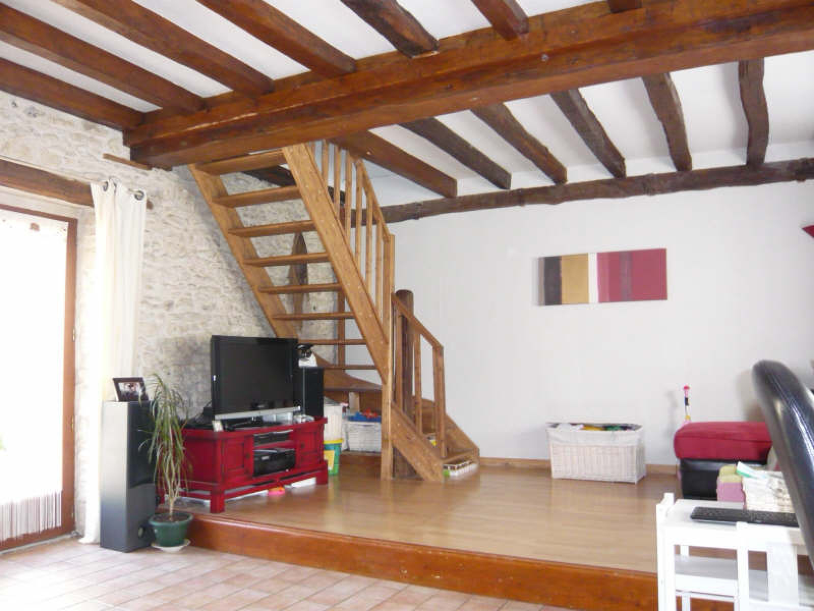 Maison ancienne comprenant entrée, cuisine américaine aménagée et équipée, salon avec cheminée insert.~A l'étage : 2 chambres, dressing, salle de bains avec wc.~Cave. Petite cour avec abri bois et barbecue.~Ecoles sur place.~Réf 1178