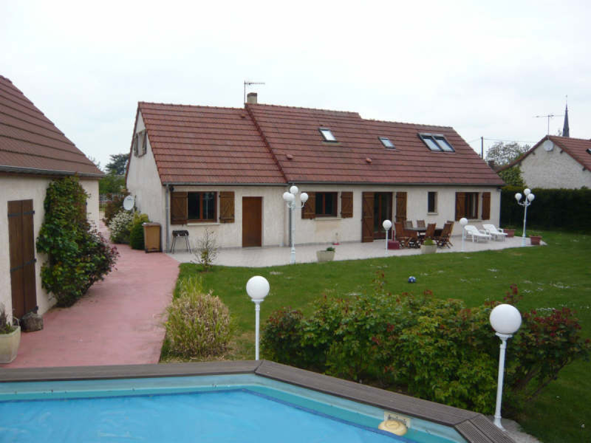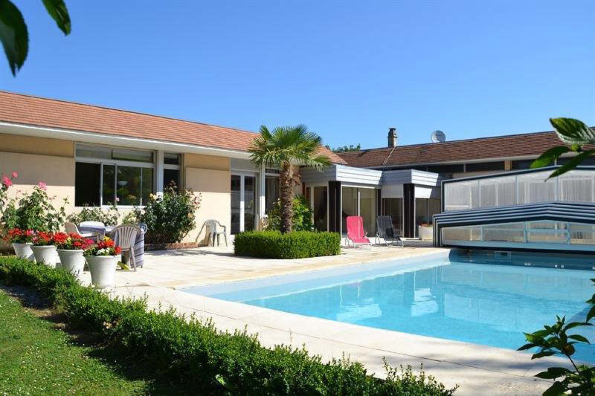 Maison d'architecte comprenant entrée, grand séjour avec cheminée insert, cuisine aménagée et équipée, arrière-cuisine / buanderie, salle de bains, wc, 3 chambres dont une avec dressing, salle de douche à l'italienne avec wc.~2 chambres indépendantes avec salle de bains et wc.~Grande dépendance comprenant partie garage, salle de jeux, chaufferie.~Piscine 10 x 5. Terrain clos d'environ 5.000 m².~Réf 2434