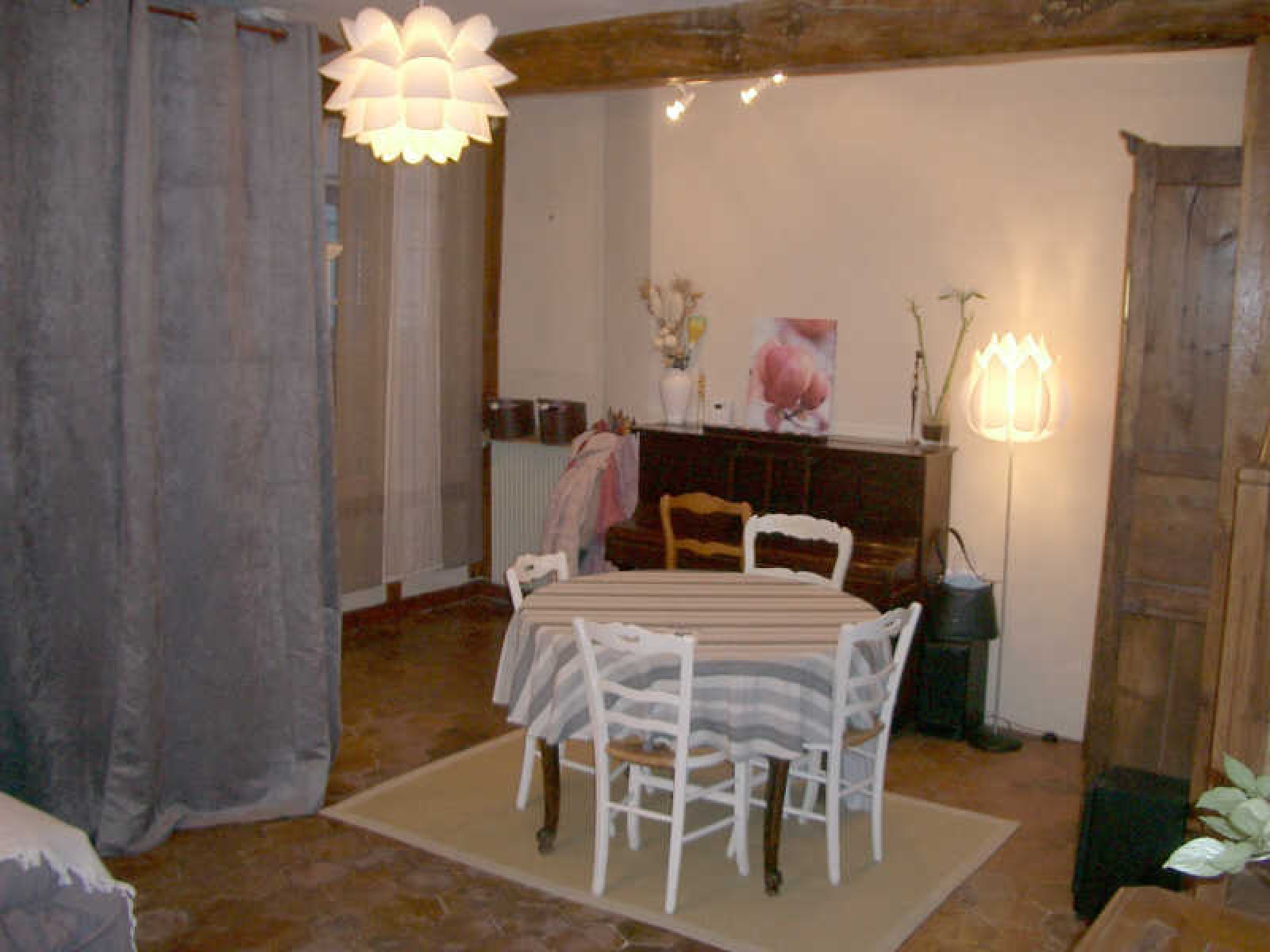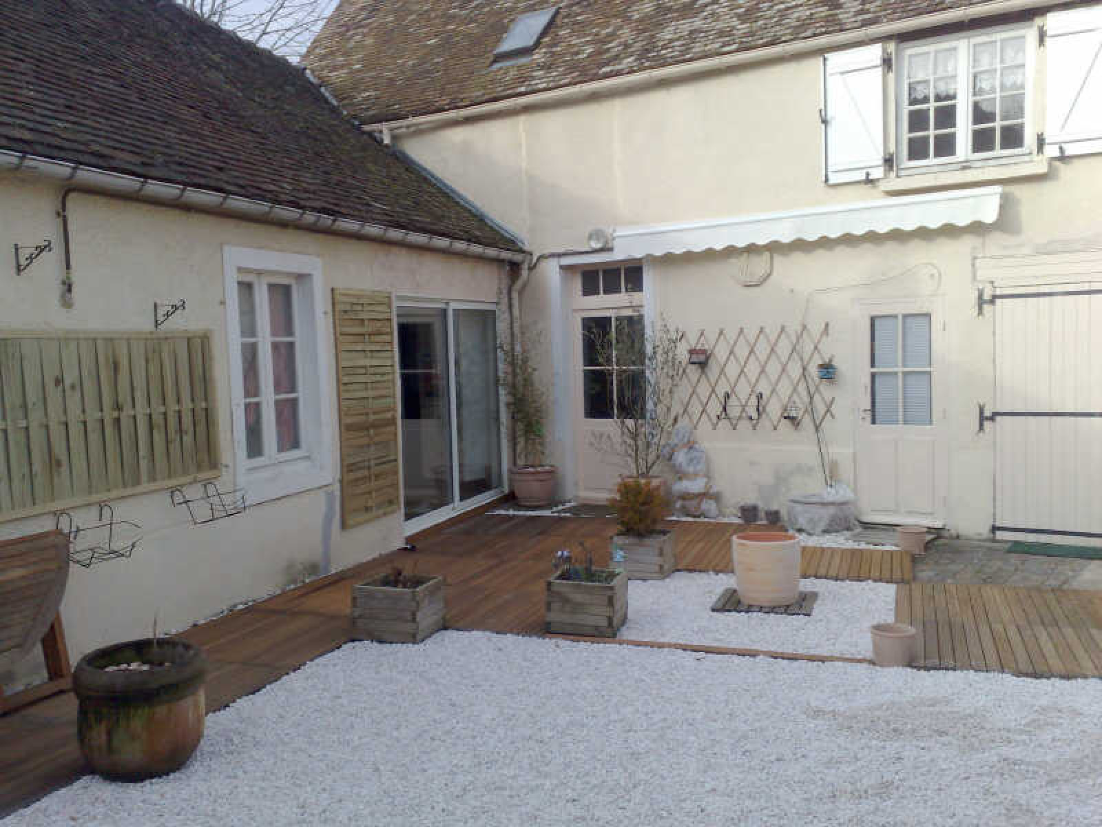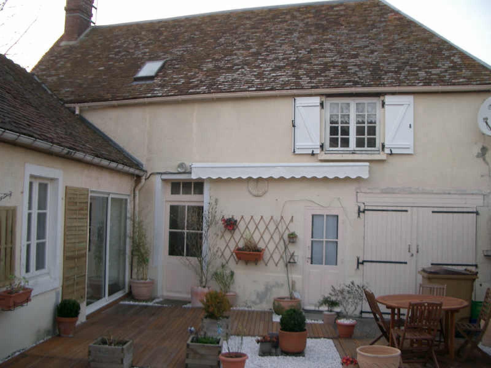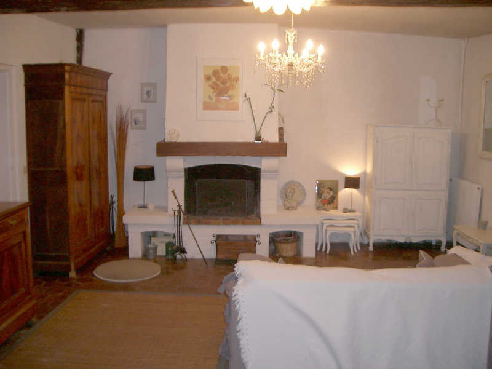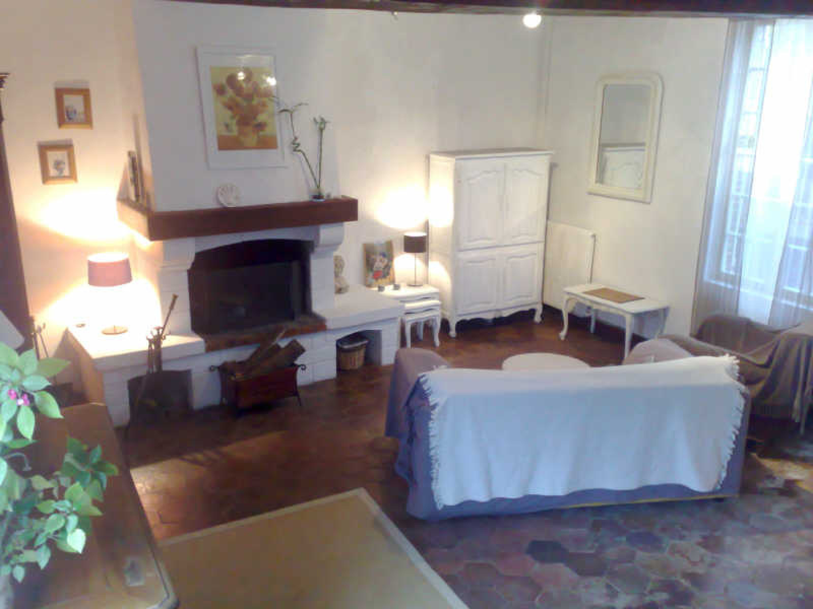 Maison ancienne comprenant entrée, salon avec cheminée (tomettes), cuisine aménagée et équipée, salle de bains avec wc.~A l'étage : palier, 3 chambres, salle de bains avec wc.~Garage. Chaufferie avec buanderie. Bûcher avec rangement et grenier.~Terrasse et cour gravillonnée.~Réf 719
