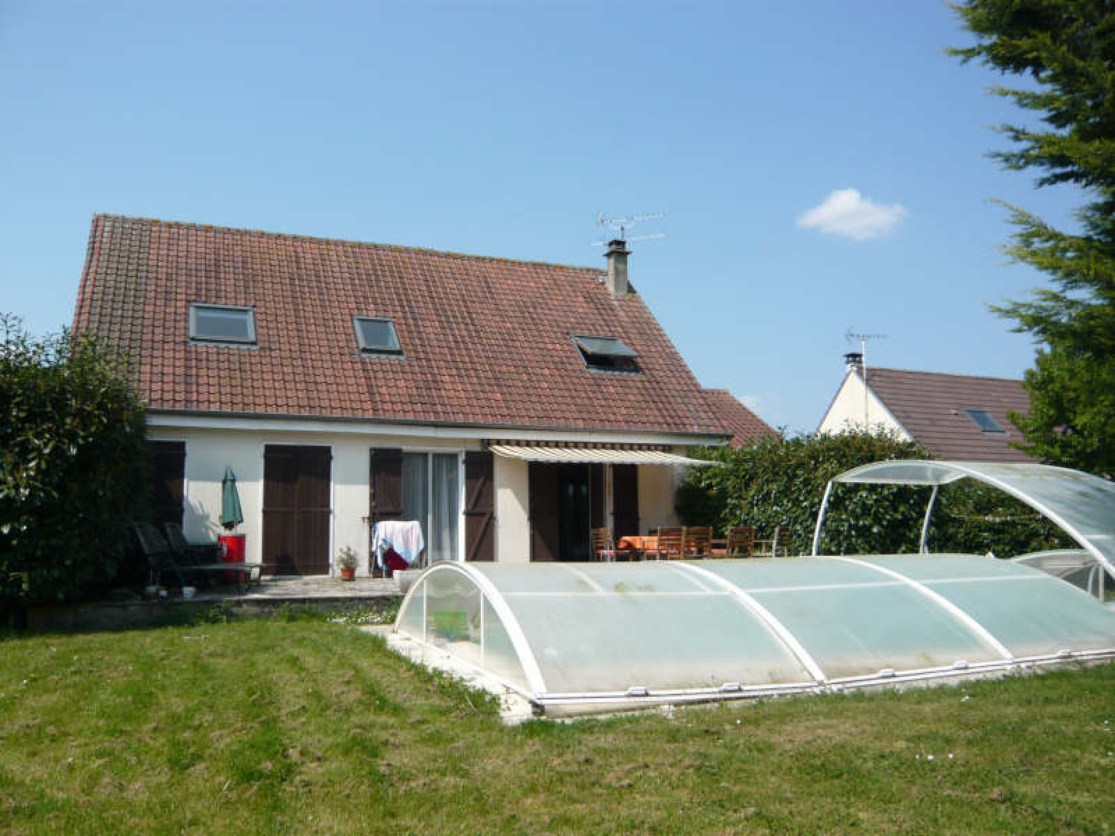 Pavillon comprenant entrée, cuisine aménagée, séjour avec cheminée, 3 chambres dont une avec salle de bains, salle de douche, wc.~A l'étage : grande pièce palière, 2 chambres, pièce pour salle de bains.~Terrain clos d'environ 1.290 m² avec piscine couverte.~Réf 1402