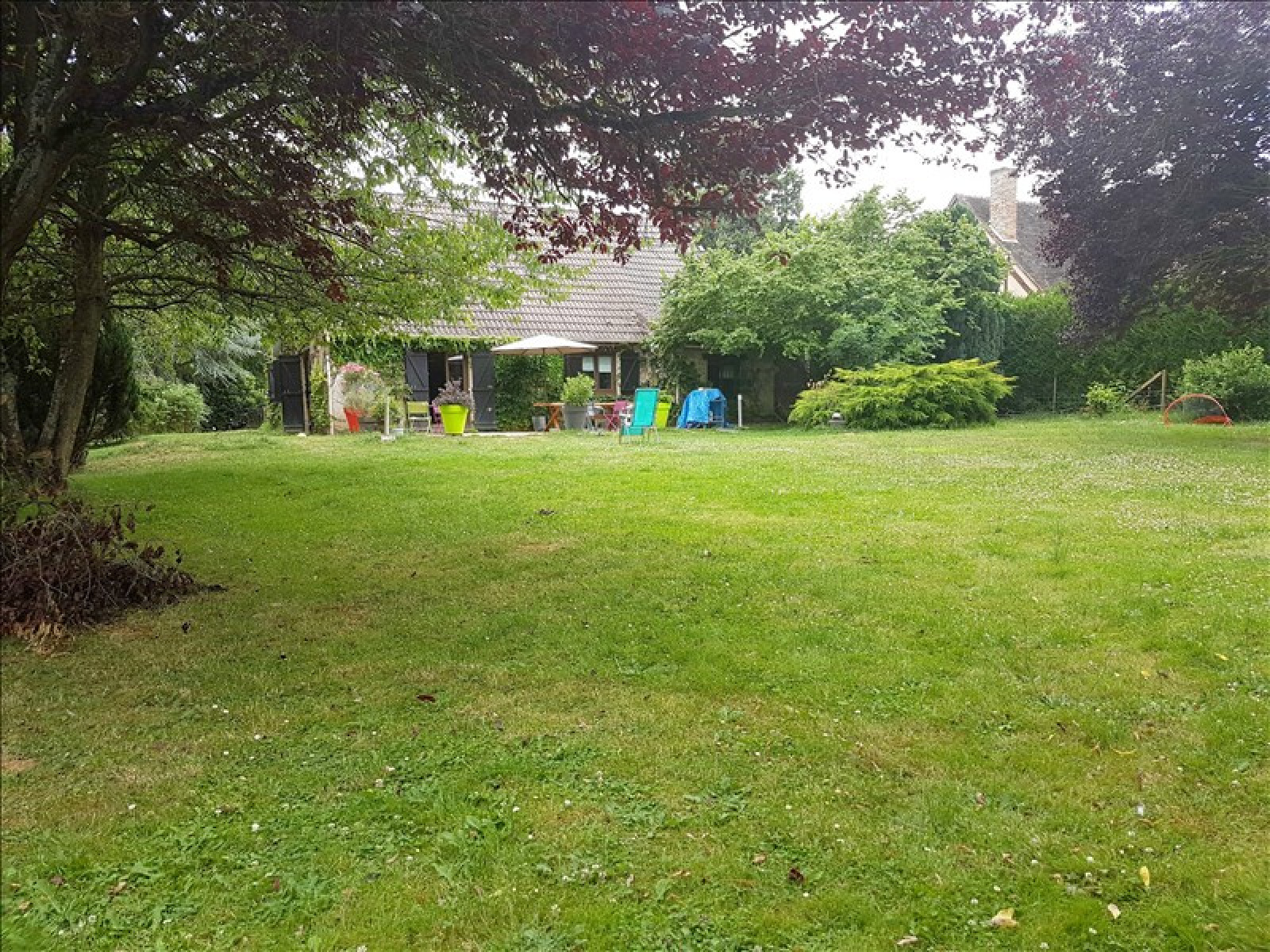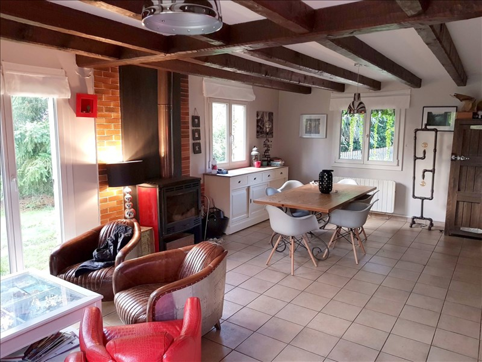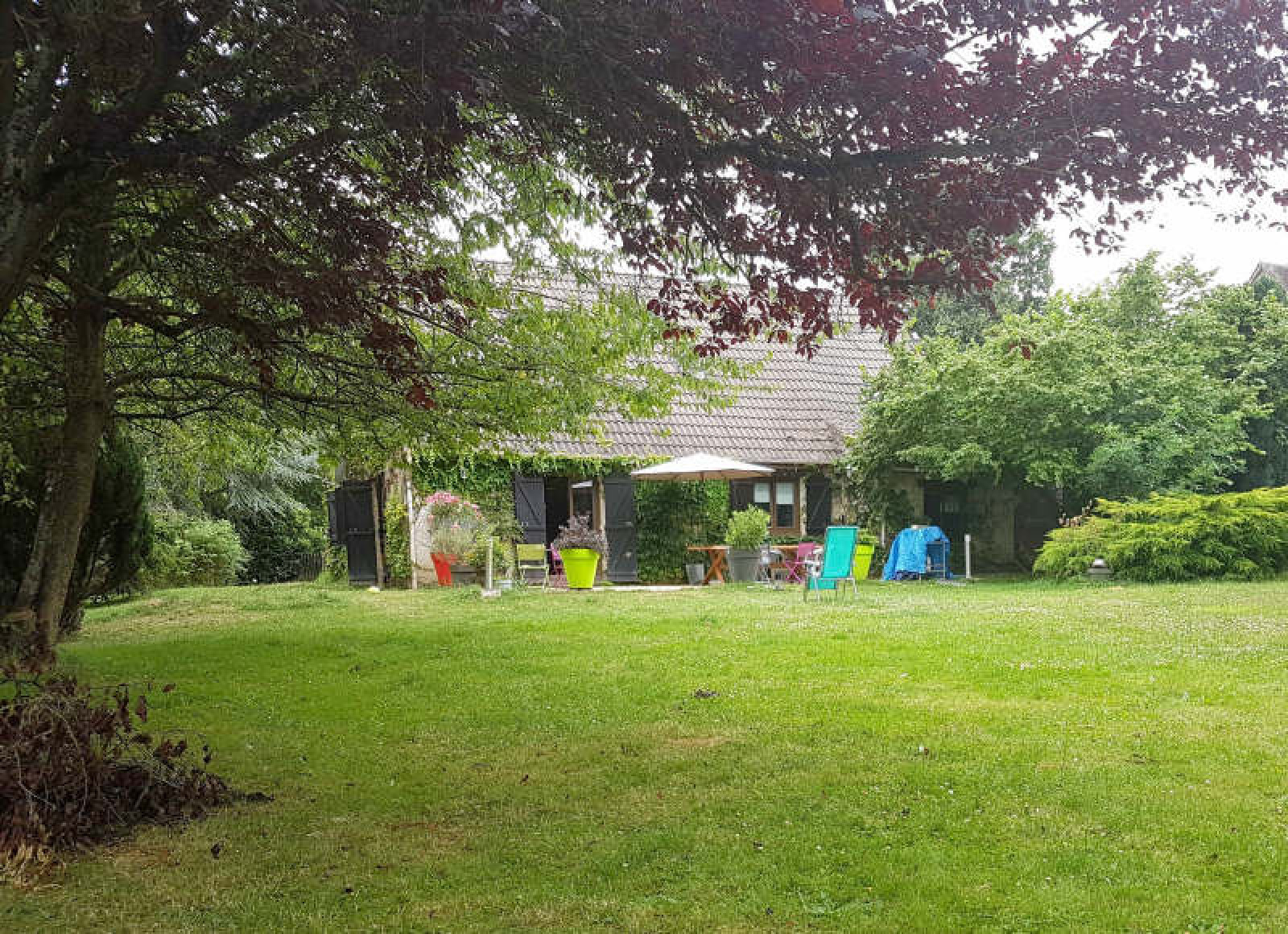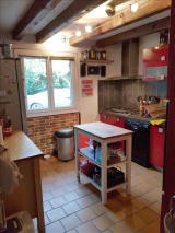 Pavillon comprenant séjour avec poêle, cuisine américaine aménagée, 2 chambres, salle de douche, wc, buanderie.~A l'étage : 3 chambres, dressing, salle de bains avec wc.~Garage. Terrain clos d'environ 2.000 m².~Réf 3356