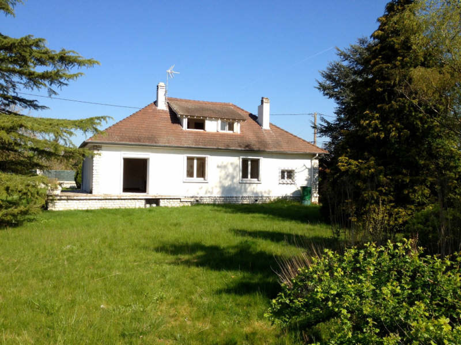 Pavillon comprenant entrée, séjour avec cheminée, cuisine aménagée et équipée, 2 chambres, salle de bains, wc.~A l'étage : chambre avec point d'eau et wc, grenier.~Garage, chaufferie. Grenier au-dessus. 2ème garage.~Terrain clos d'environ 2.350 m².~Réf 2444