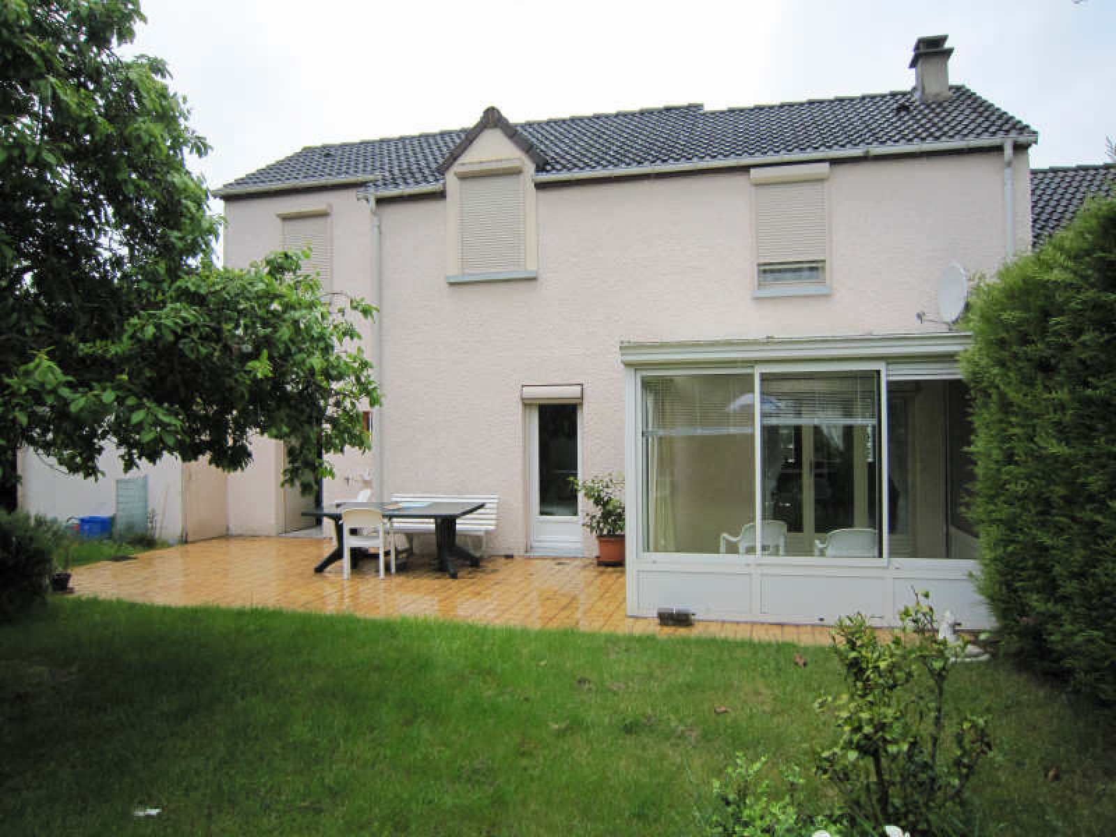 Pavillon comprenant entrée, cuisine aménagée et équipée, salon avec cheminée, véranda, chambre avec cabinet de toilette, wc avec lave-mains.~A l'étage : palier, 3 chambres, salle de douche, salle de bains avec wc.~2 garages.~Terrain clos d'environ 492 m².~Réf 2204