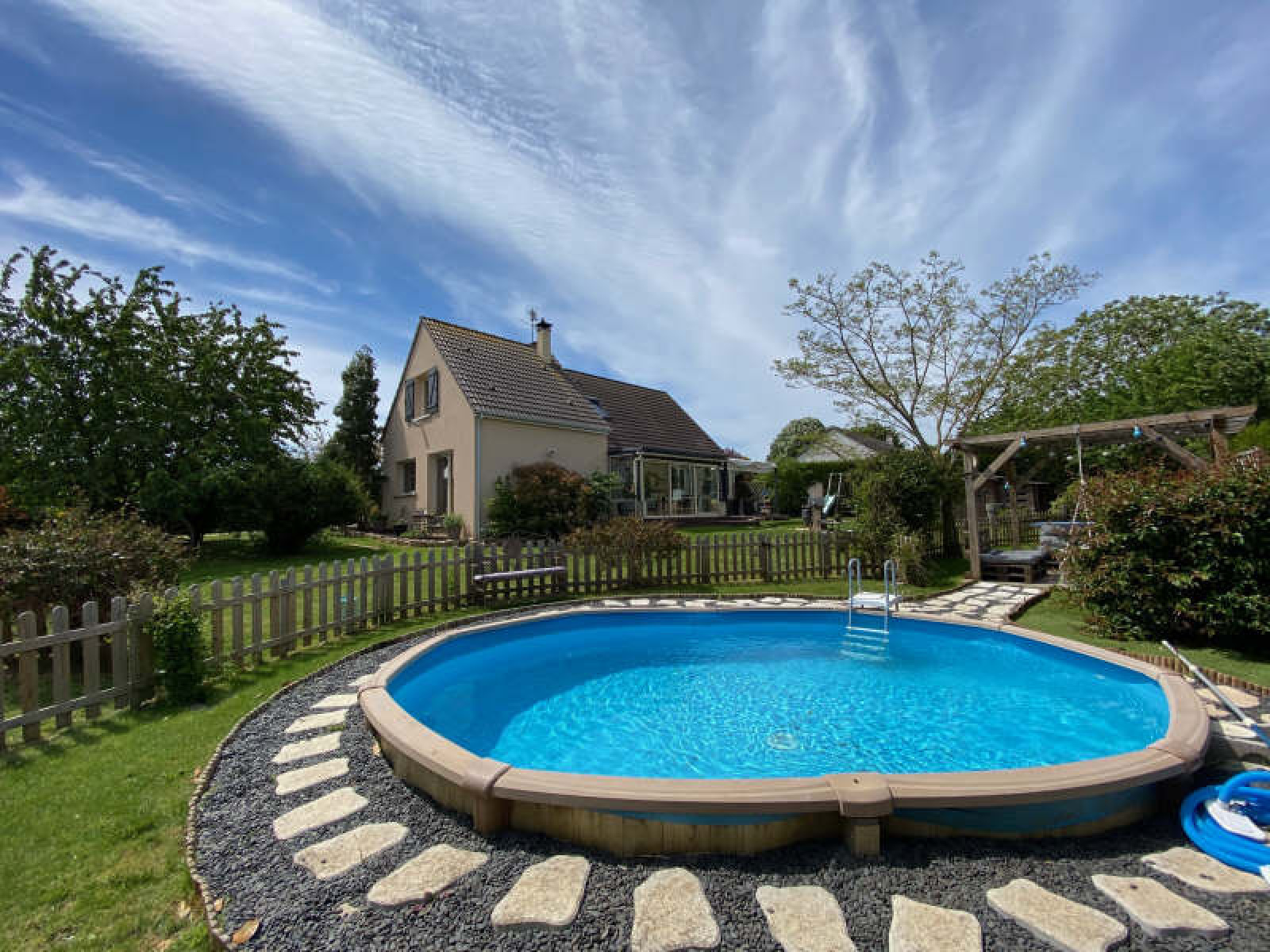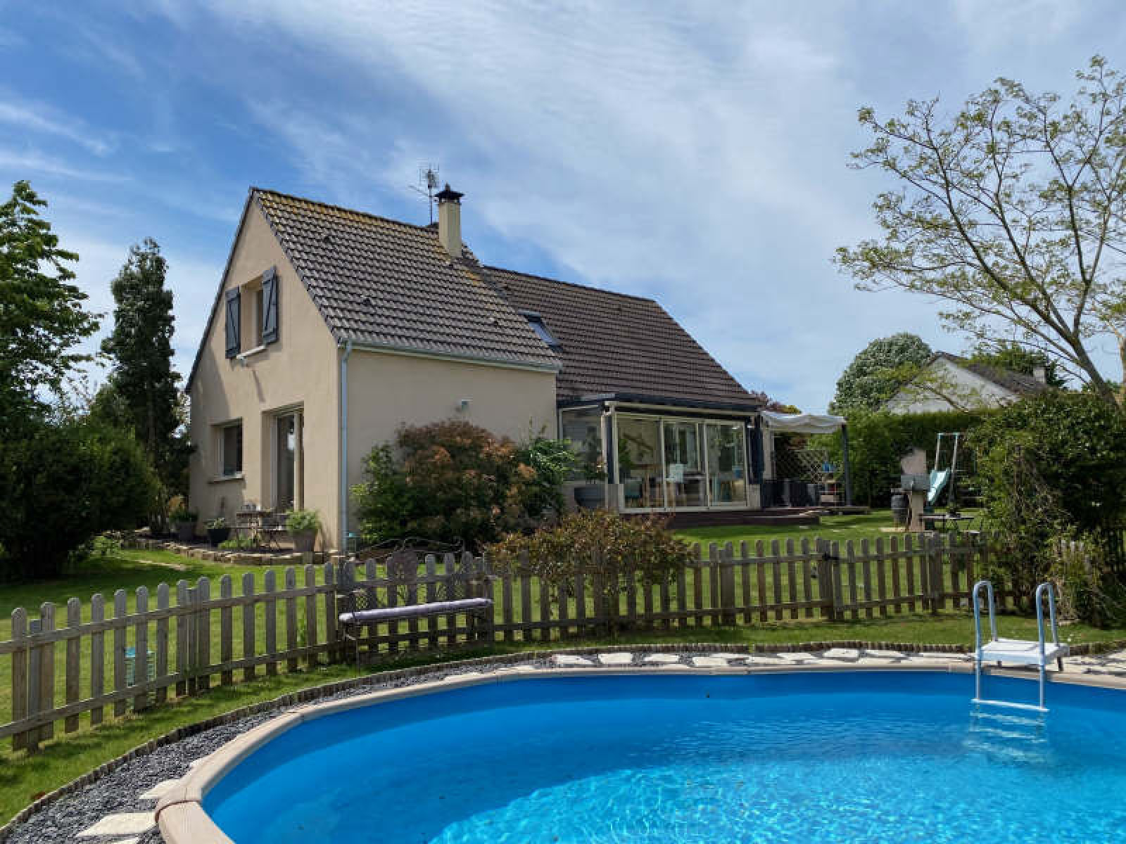 7 minutes HOUDAN~Maison traditionnelle comprenant 2 entrées, cuisine aménagée et équipée, grand séjour avec cheminée, véranda, chambre, salle de bains avec douche, wc, buanderie.~A l'étage : 3 chambres dont une avec dressing, wc.~Garage double. Cabanon de jardin.~Terrain clos d'environ 1.480 m² avec piscine semi-enterrée.~Réf 3926