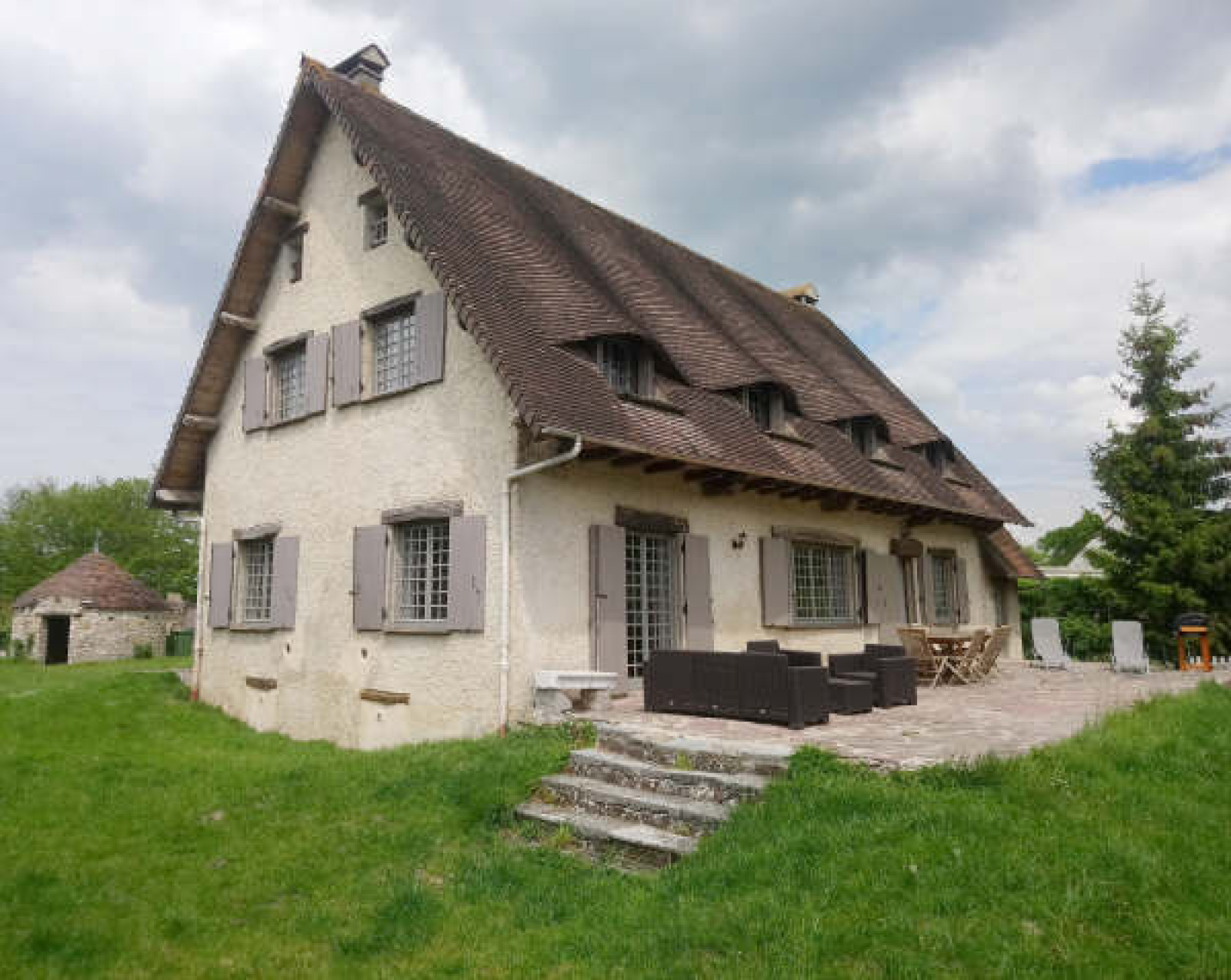 7 minutes HOUDAN dans le 78~Maison style rustique comprenant séjour avec cheminée, cuisine américaine aménagée et équipée, buanderie, wc, atelier.~Au premier étage : palier, salle de bains avec wc, dressing, 3 chambres dont une avec dressing, salle de bains et wc. ~Au second étage : palier, 2 chambres, salle de bains avec wc.~Garage. A l'étage : palier, chambre, salle de douche, wc. ~Pigeonnier. Terrain clos d'environ 1.230 m².~Beaucoup de charme, beaux volumes.~Réf 3786