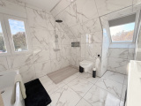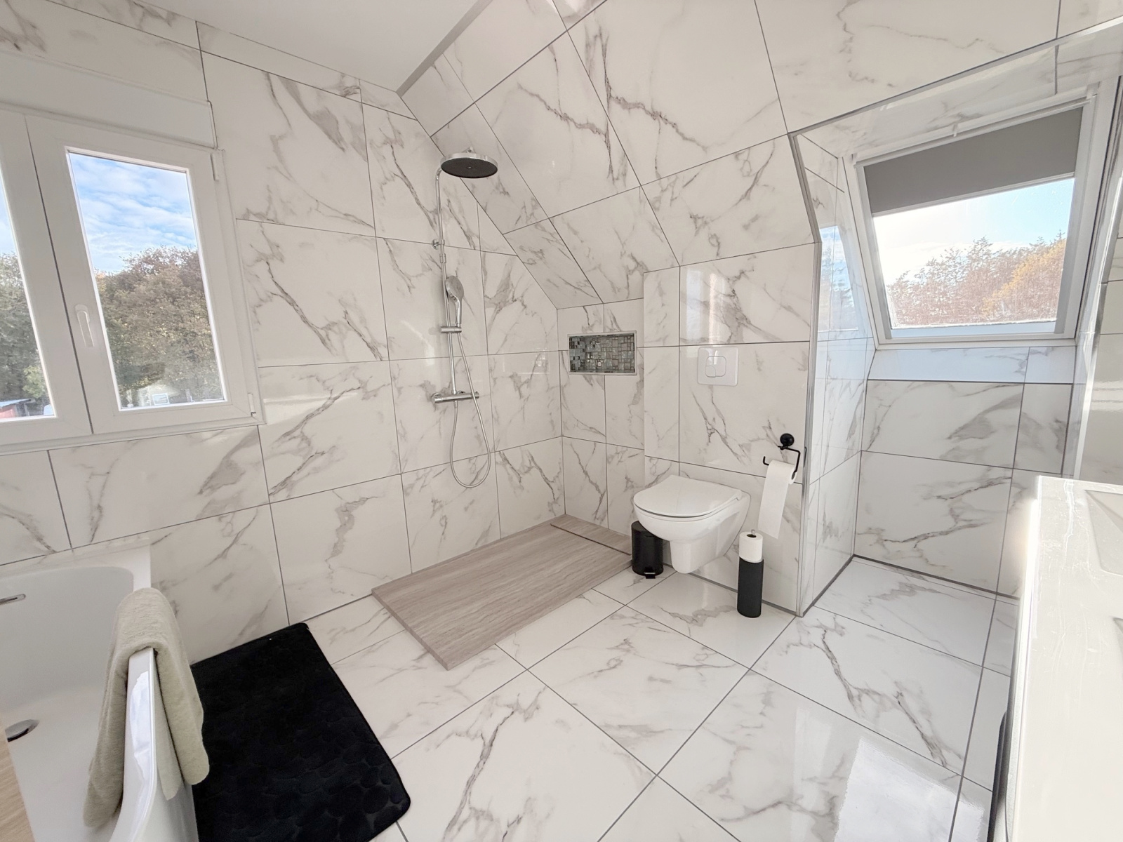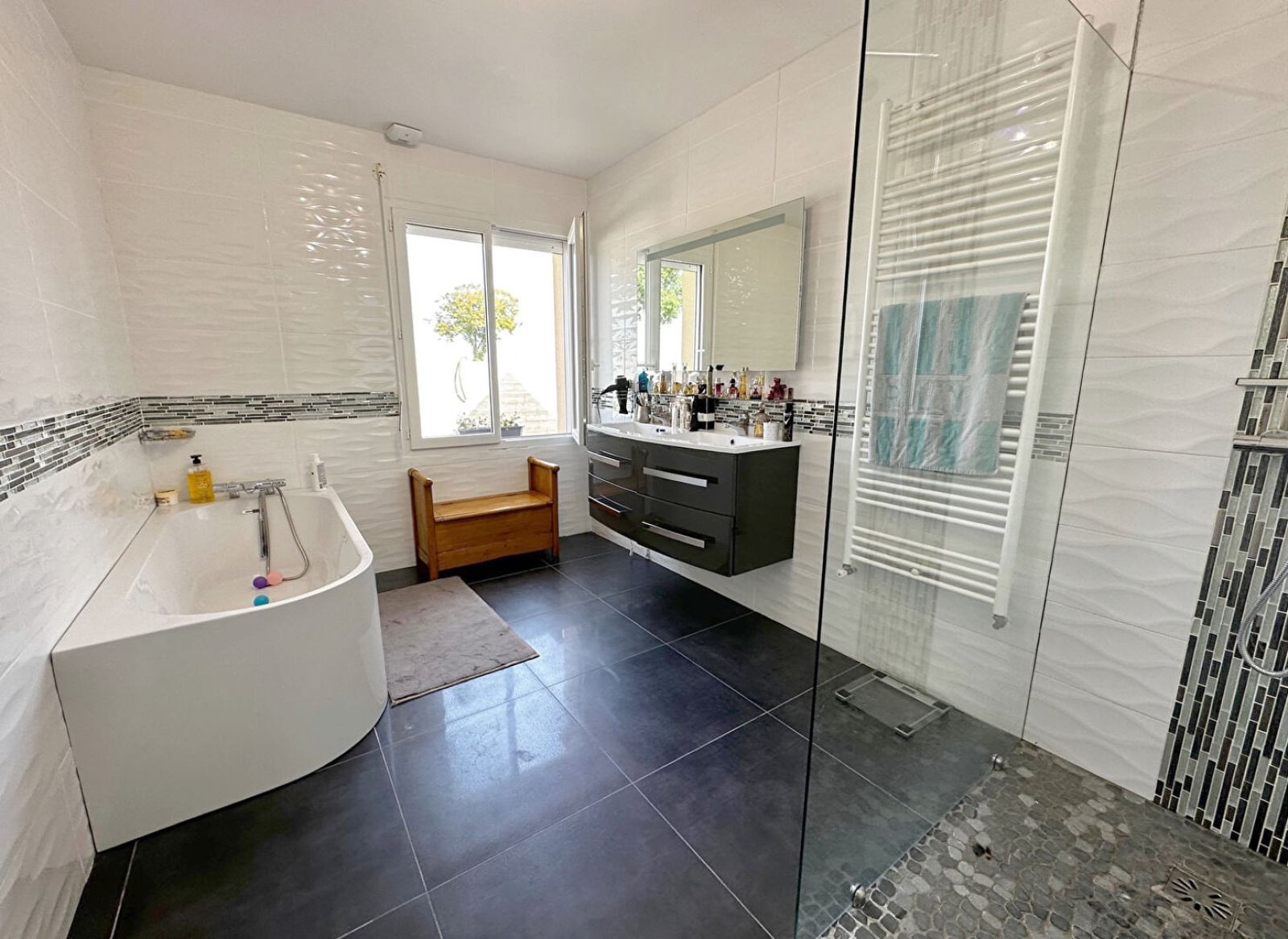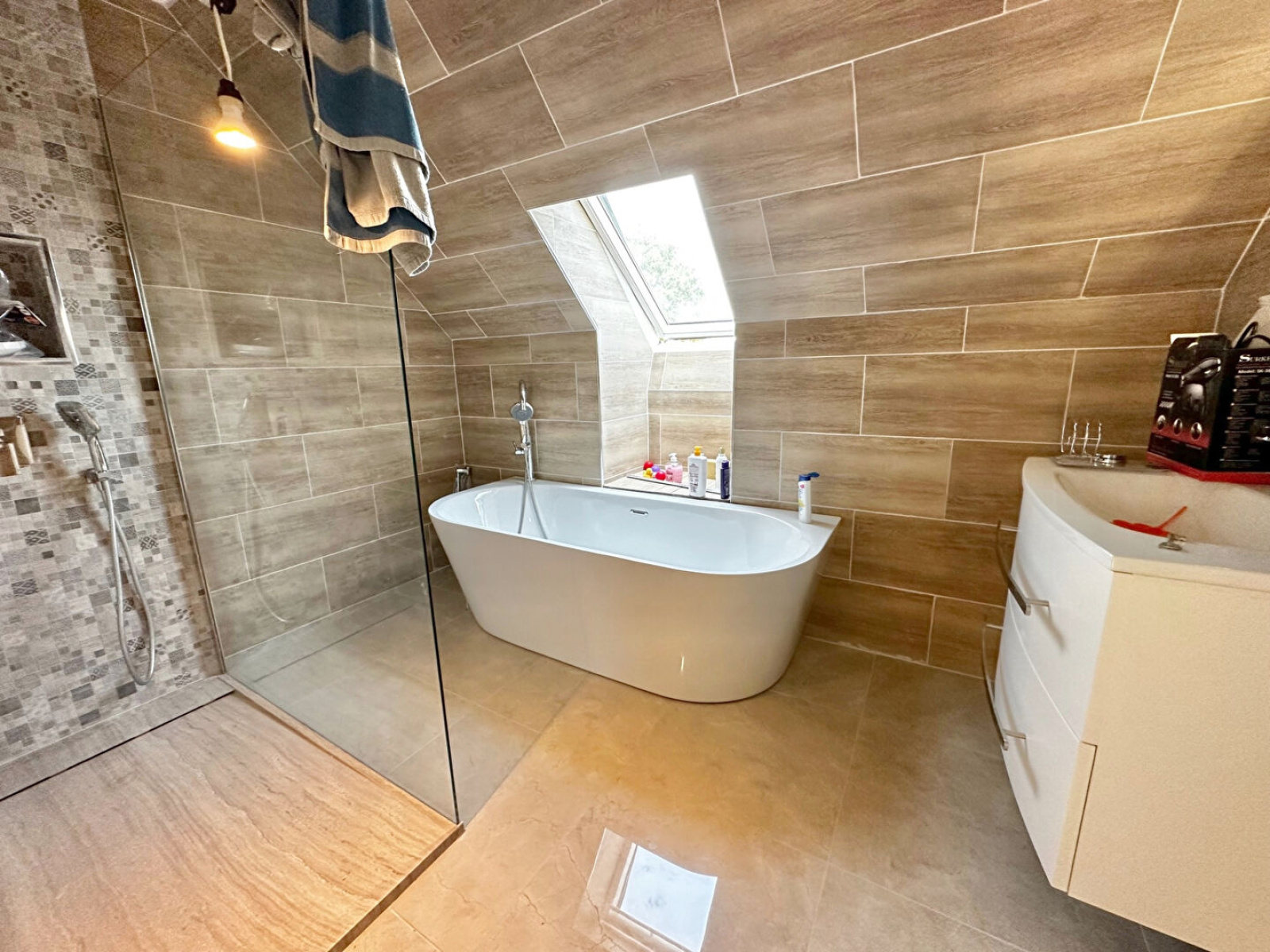 A l'étage : salle de bains avec douche, wc, trois chambres dont une grande avec dressing, salle de bains, douche et wc.