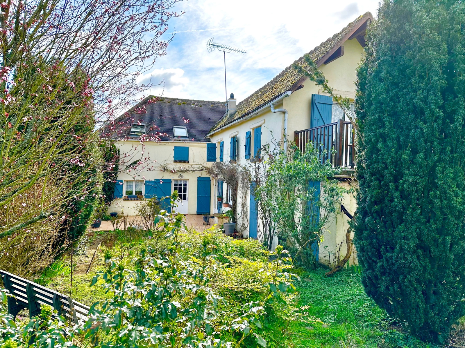 A l'étage : pièce palière, trois chambres dont une avec balcon, bureau, salle de douche, wc.