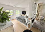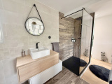 A l'étage : grande chambre avec grande terrasse, salle de douche avec wc. Deux dépendances d'environ 10 m². Cave.
