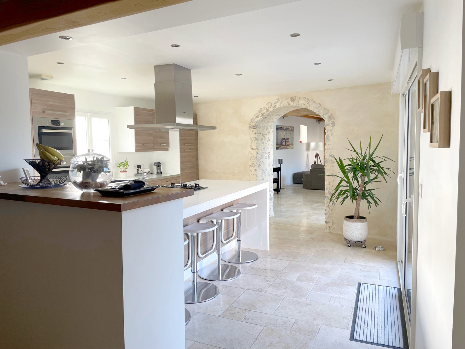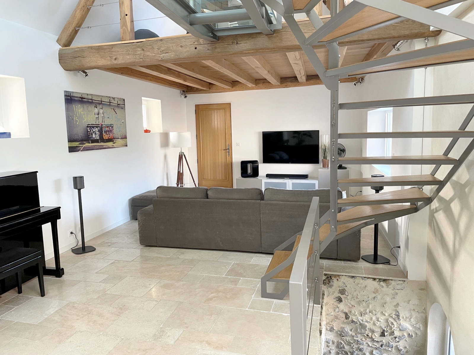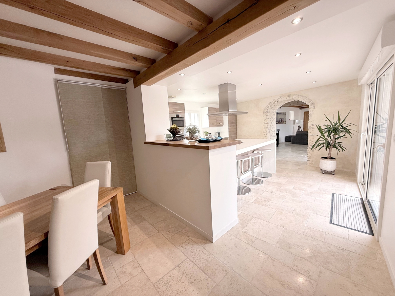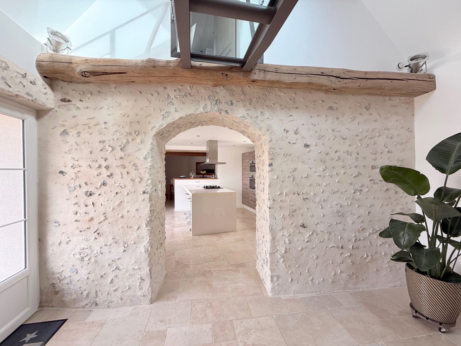 Maison ancienne restaurée comprenant grande entrée, séjour cathédrale, cuisine aménagée et équipée avec salle à manger, buanderie, chambre, salle de douche, wc avec lave-mains, bureau.