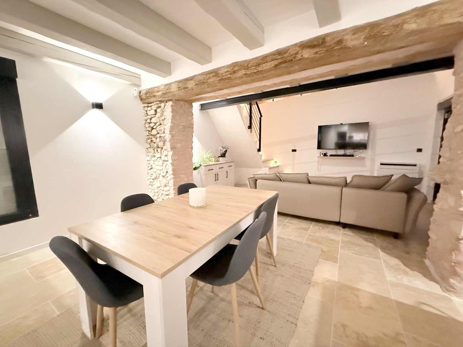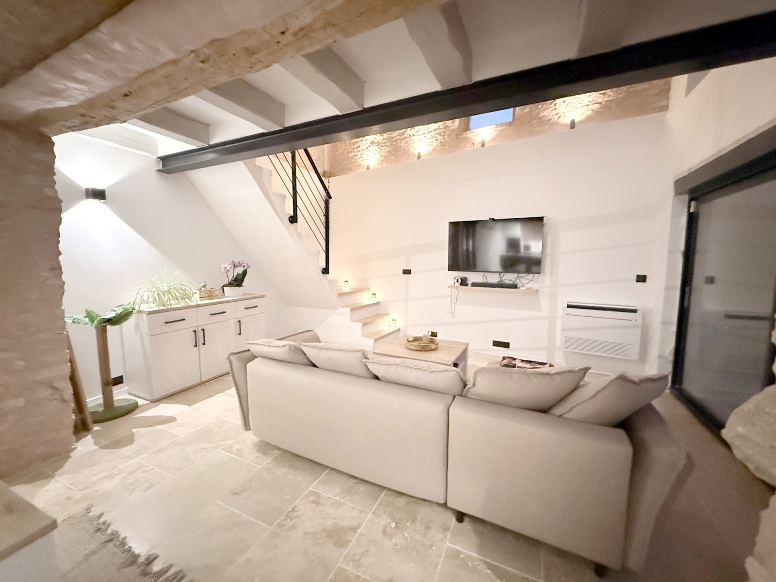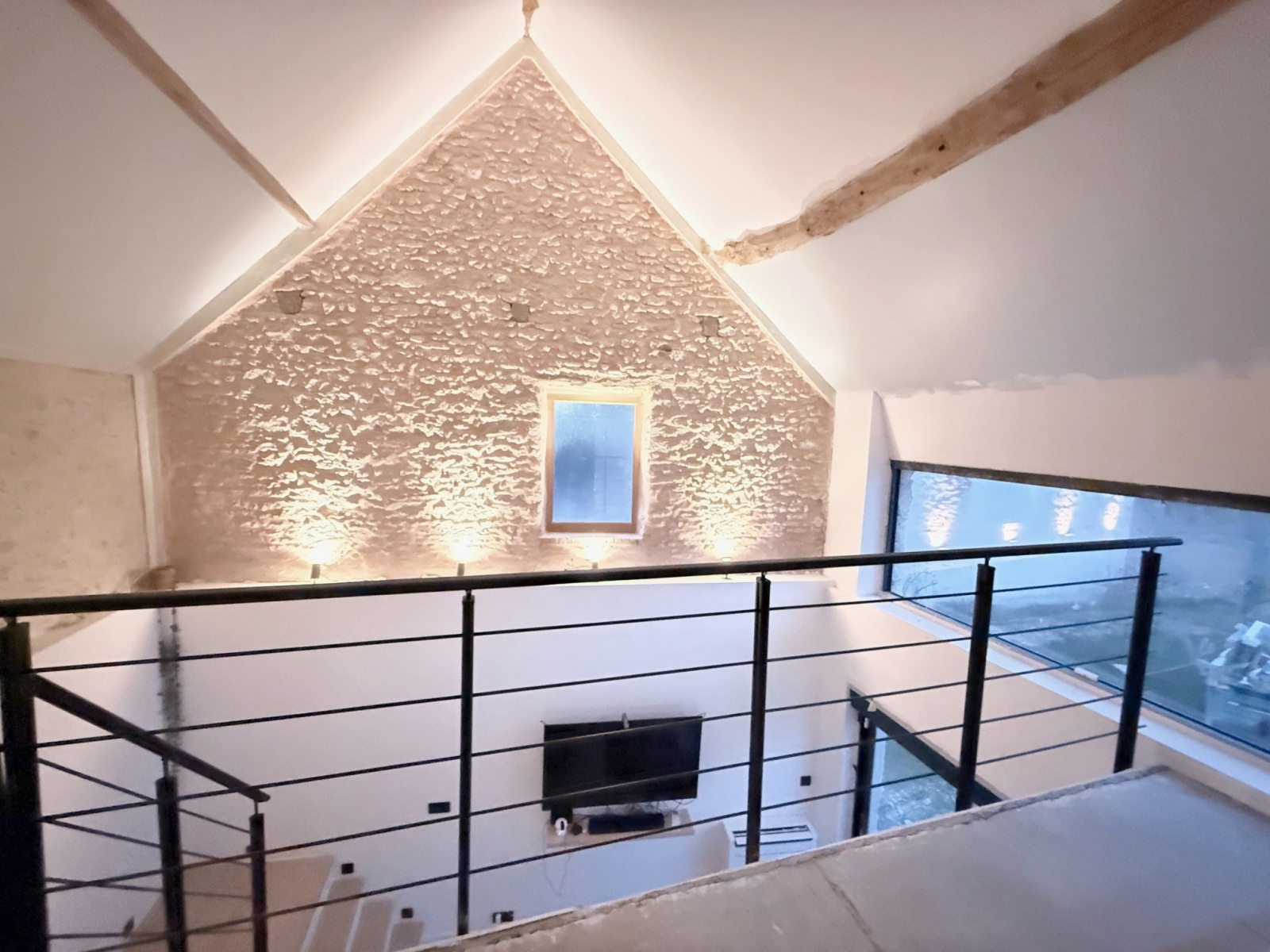 Maison ancienne comprenant entrée, grand séjour en partie cathédrale, cuisine américaine aménagée et équipée, suite parentale (chambre, salle de bains avec douche à l'italienne, dressing), wc avec lave-mains, buanderie.