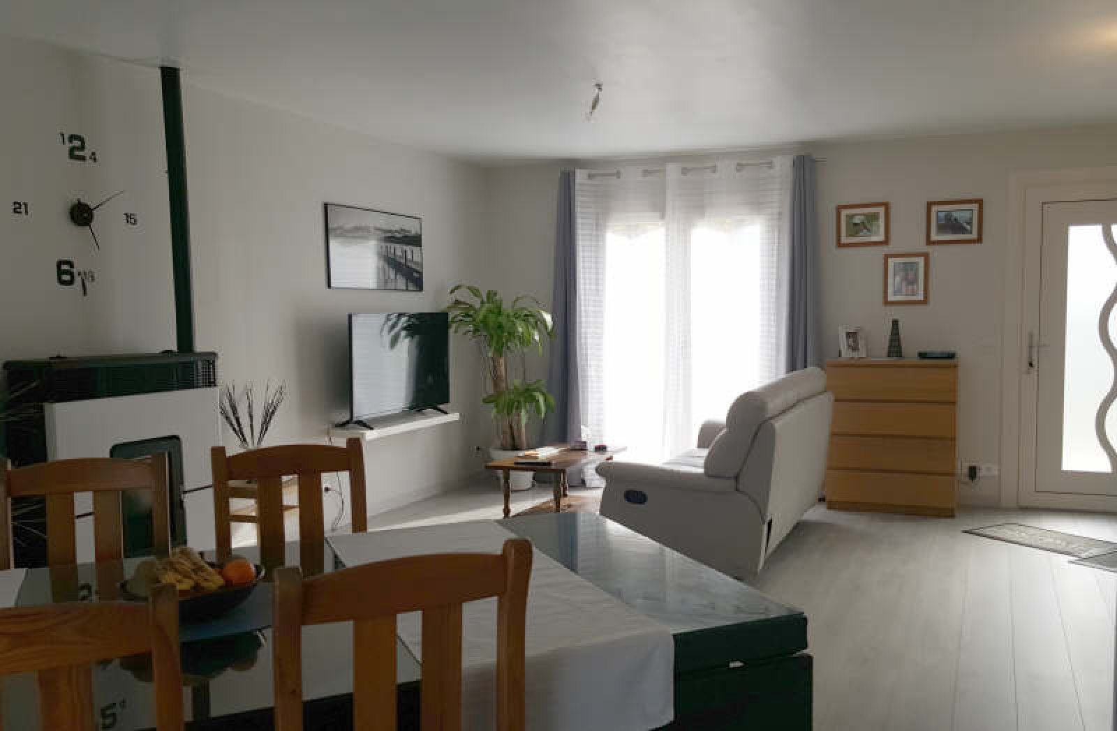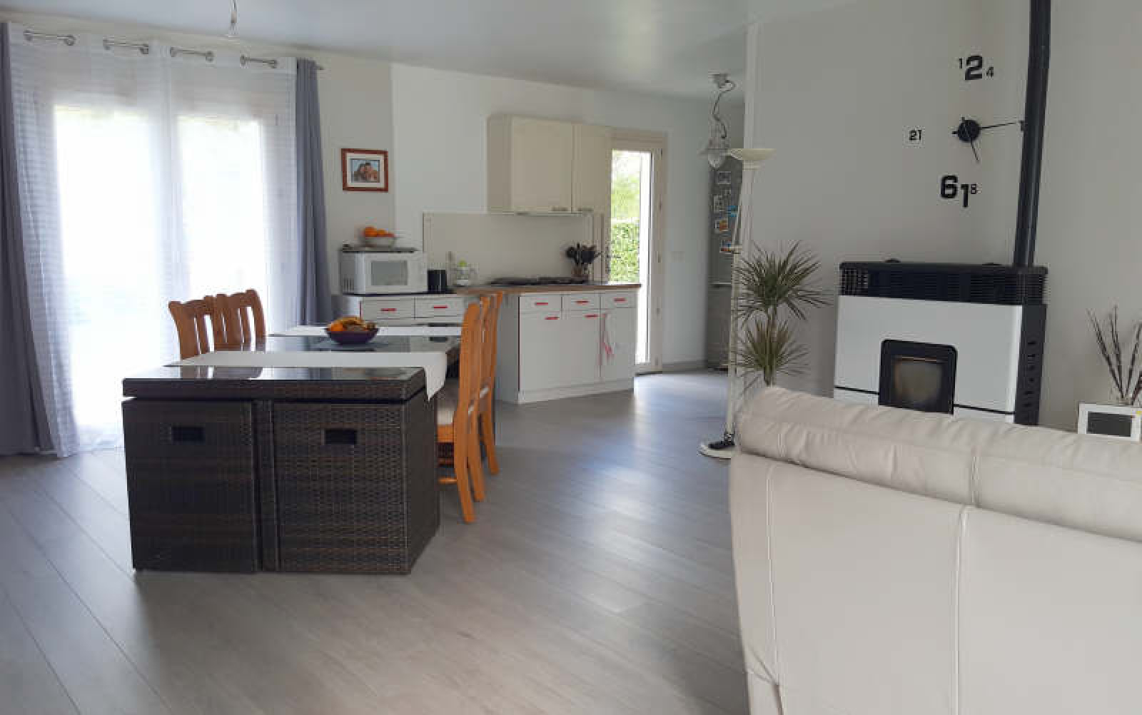 Secteur ANET~Maison traditionnelle comprenant grand séjour avec poêle à granules, cuisine américaine aménagée, 3 chambres, salle de douche, wc.~A l'étage : palier, 2 chambres, salle de douche, wc.~Garage.~Terrain clos d'environ 1.200 m², au calme.~Réf 3740